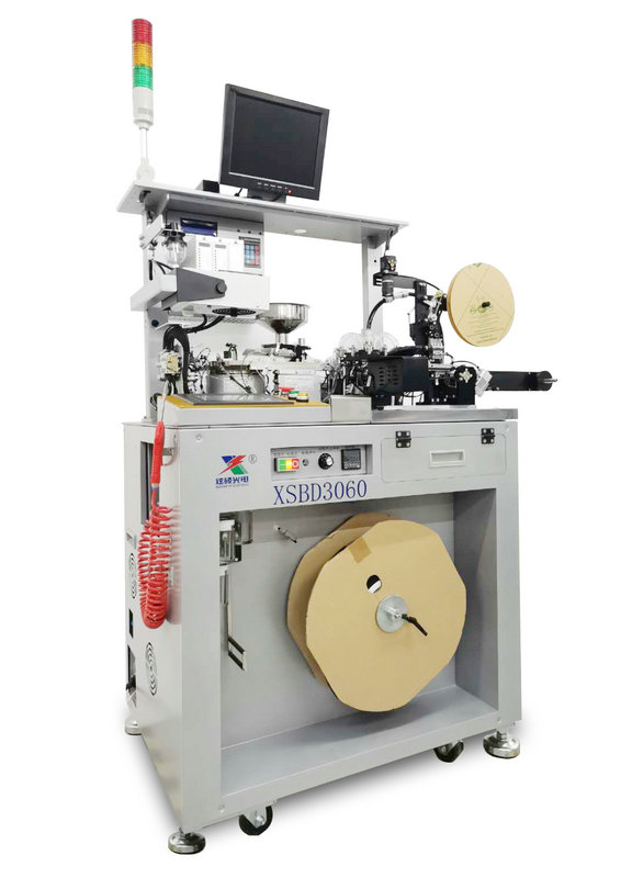 炫硕智造自主研发的全自动编带机,对贴片式LED进行封装工序,贴片式LED元件通过高速震荡送料器和高速转塔式吸取头载入卷带,并进行侧料、反料、空料、极性原位检测后,进行热压包装。