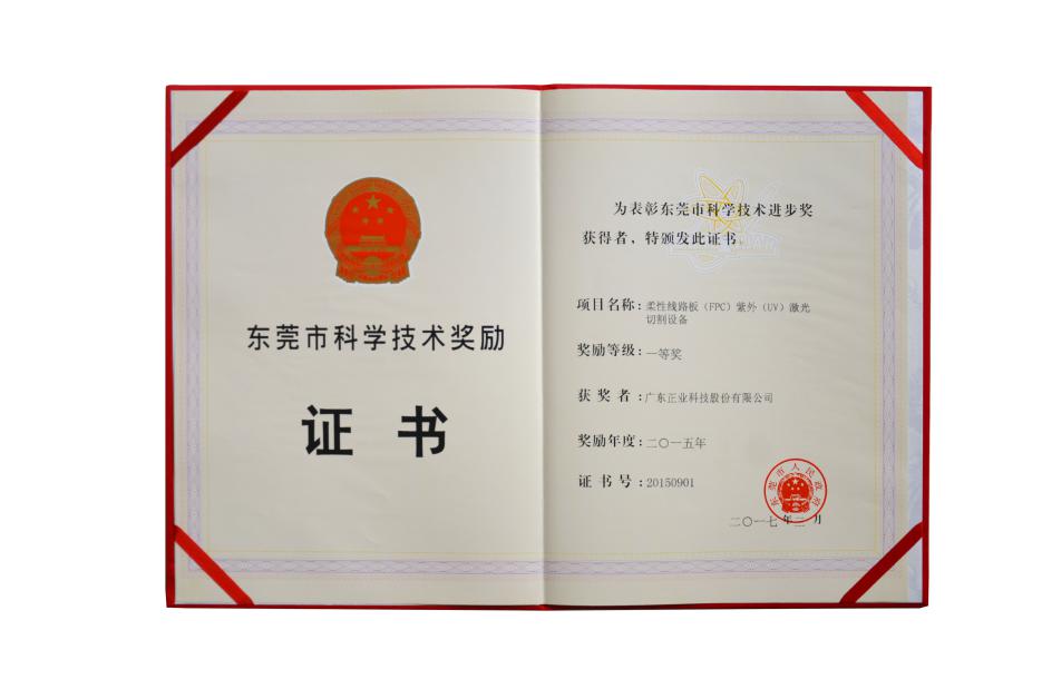 2017年3月,由东莞市政府颁发,广东黄瓜视频污污污科技股份有限公司(股票代码:300410)荣获东莞市科技进步一等奖,获奖项目为“柔性线路板(FPC)紫外(UV)激光切割设备”。